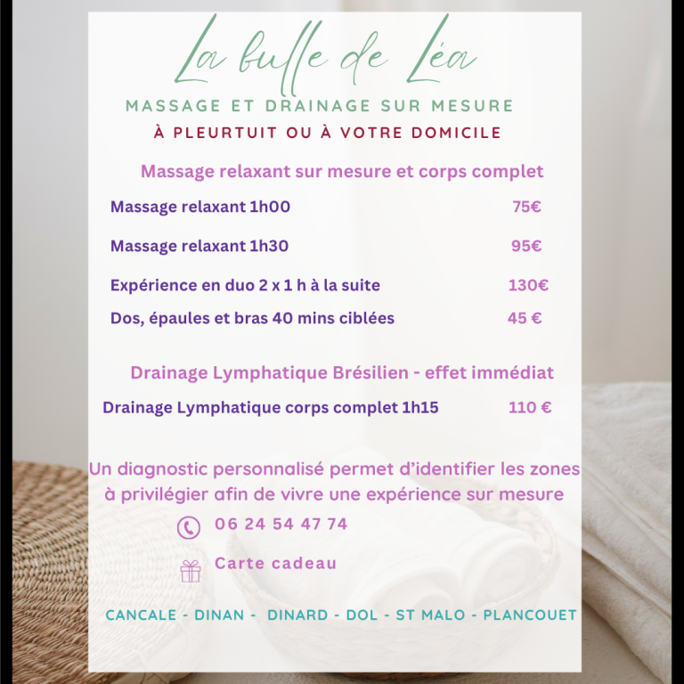 Je me déplace jusque 30 km autours de Pleurtuit afin de vous apporter relaxation et apaiser vos muscles.